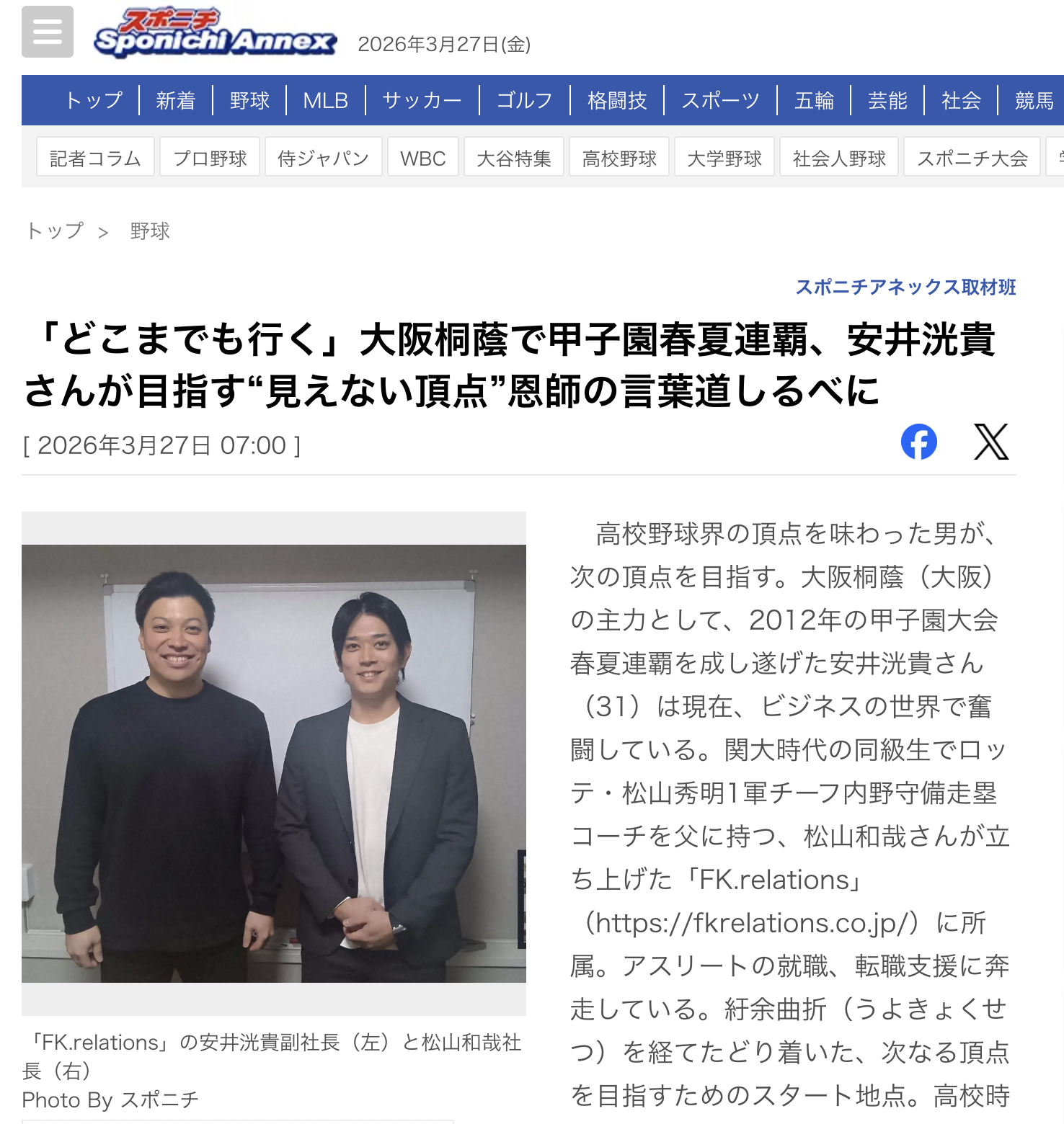 お知らせ 2026.03.27 弊社副社長インタビューが「スポニチ」に掲載されました https://www.sponichi.co.jp/baseball/news/2026/03/27/gazo/20260326s10001002217000p.html